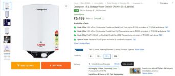 Crompton 15 L Storage Water Geyser At Rs.5499 is available on Flipkart.