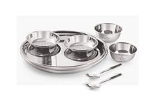 • Package Contents: Bhojan Set 8 Pcs Lazer Etching Designed Including – 2 Pcs Full Plate (Diameter: 26.9 Cm, Height: 2 Cm), 2 Pcs Bowl (5 Cm), 2 Pcs Halwa Plates (5 Cm) and 2 Pcs Spoon